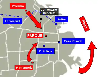 Les troupes révolutionnaires une fois concentrées dans le Parc d’artillerie, le général Manuel J. Campos modifia le plan établi le soir précédent, et au lieu d’attaquer les positions du gouvernement et d’assaillir la Casa Rosada, donna à ses troupes l’ordre de rester campées à l’intérieur du Parc.