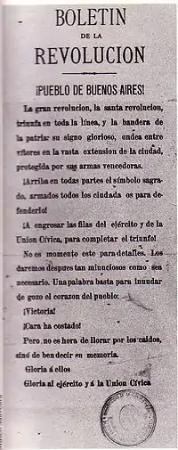 La création de l’Union civique fut ensuite couronnée par une marche collective vers la place de Mai, à l’avant de laquelle défilaient en se tenant par le bras Mitre, Alem, Del Valle, Vicente López et Estrada. Bientôt, dès le début de la marche, des milliers de citadins se mirent à la rejoindre, remplissant les rues du centre-ville et faisant d’elle le premier rassemblement politique de masse de l’histoire argentine contemporaine[5]. La manifestation provoqua une grave crise politique dans le gouvernement et la démission immédiate de tous les ministres.