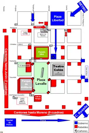 Peu après, les forces gouvernementales, empêchées d’avancer par la rue Libertad ou Talcahuano vers la Plaza Lavalle, à cause du puissant cantonnement du palais Miró et des canons actionnés par Day, prirent l’audacieuse décision de traverser par le milieu les îlots situés au sud de la Plaza Libertad. Ainsi parvinrent-elles jusqu’à l’angle des rues Viamonte et Libertad et purent-elles se poster en face du cantonnement du palais Miró et à l’angle nord-est de la Plaza Lavalle, y installant aussi un de leurs canons. De cette manière, le centre des affrontements fut déplacé vers la Plaza Lavalle, qui se mua alors en un grand champ de bataille.