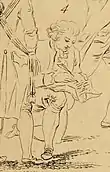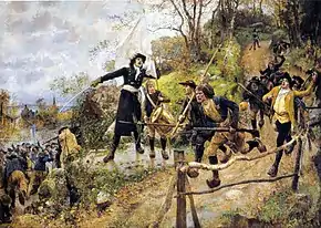Le lendemain 17 juillet, la pétition est déposée au Champ-de-Mars, sur laquelle se rassemble une foule de 5 000 personnes[Note 9]. À la suite d’incidents, la loi martiale est décrétée par la municipalité, dirigée par Bailly. La Fayette fait tirer sur la foule. La fusillade du Champ-de-Mars[81] qui fera 50 morts crée une rupture durable entre les monarchistes constitutionnels et les autres révolutionnaires, démocrates[82], comme Danton, Marat ou Robespierre ou républicains comme Condorcet.
