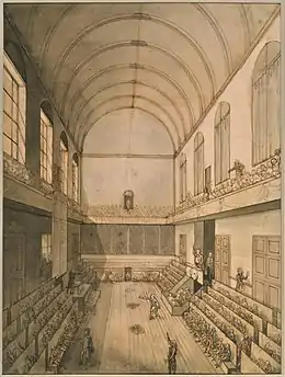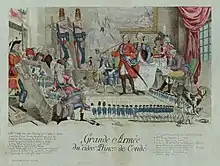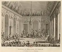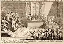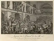 Lors de la séance royale du 23 juin 1789, Louis XVI, jusqu'alors silencieux[38], définit un programme de travail, proposant aux députés de réfléchir aux réformes concrètes dont il esquisse l'économie et ordonne aux députés de siéger en chambres séparées. Alors que les députés de la noblesse et du haut clergé obéissent, les députés du tiers état et ceux du bas clergé restent immobiles. Bailly, élu président en tant que doyen, répond au marquis de Dreux-Brézé leur sommant de se retirer que la « Nation assemblée n'a d'ordre à recevoir de personne » et Mirabeau l'apostrophe en affirmant que seule la force pourrait les faire quitter les lieux[39]. Face à cette résistance, le roi invite le 27 juin les trois ordres à débattre ensemble[40].