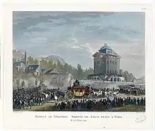 Alors qu’à cette période Louis XVI possède d'importantes prérogatives constitutionnelles, que le système monarchique n’est pas contesté[72] et que la figure royale n'est encore que peu attaquée[73], la tentative de fuite du roi, les 20 et 21 juin 1791, est une date clé de la Révolution[74] : elle rompt les liens symboliques unissant le roi à la nation[75], précipite la désacralisation de la personne royale[76] et le renversement de l'opinion à son égard[77] et relance enfin la crainte du complot intérieur préparant l'invasion, provoquant une série de lois d'urgence qui préfigurent la Terreur[78].