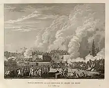 Face à la foule marchant sur la Bastille, son gouverneur, le marquis de Launay, accède à la demande de médiateurs venus de l'Hôtel de Ville et accepte par écrit la reddition de la forteresse sous la promesse qu'il ne sera fait aucun mal à la garnison. Il laisse la foule pénétrer dans la première cour. Il se ravise et fait tirer à la mitraille : il y a des morts. Des Gardes françaises mutinées amènent alors des canons pris aux Invalides : le gouverneur cède et abaisse les ponts-levis. Il est cinq heures de l'après-midi. Les Vainqueurs de la Bastille se dirigent ensuite vers l'Hôtel de Ville avec leurs prisonniers. Sur le chemin, Launay est massacré. Sa tête est découpée au canif[54]. Arrivés à l’Hôtel de Ville, les émeutiers accusent le prévôt des marchands Flesselles de trahison. Il est lui aussi lynché et sa tête promenée au bout d’une pique avec celle de Launay. Toute la journée, des barrières et des bâtiments fiscaux parisiens sont attaqués et incendiés.