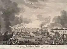 La prise de la Bastille s'explique d'abord par la volonté de trouver la poudre nécessaire aux milices bourgeoises des districts mais elle est immédiatement élevée au rang d'acte fondateur de la révolution populaire[49]. Le 14 juillet, les émeutiers du faubourg Saint-Antoine se rendent autant maîtres d'une forteresse royale que d'un symbole du despotisme. C'est aussi la première manifestation des foules révolutionnaires organisées[50]. Le matin, les émeutiers pillent l'arsenal de l’hôtel des Invalides où ils trouvent des armes et des canons. Ils arrivent ensuite aux portes de la prison royale de la Bastille et y retrouvent d'autres émeutiers massés devant la forteresse du faubourg Saint-Antoine depuis le matin[51],[52],[53].