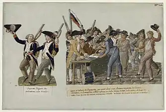 Le 31 octobre 1791, l'Assemblée nationale législative vote un décret qui exige des émigrés qu'ils reviennent en France dans un délai de deux mois sous peine de voir leurs propriétés confisquées[Note 14] ; le 29 novembre suivant, deux autres décrets sont votés : un premier concernant l'Électeur de Trèves qui doit disperser l'armée des émigrés[101], un second qui impose le serment civique aux prêtres réfractaires, sous peine de privation de pension ou même de déportation en cas de trouble à l'ordre public.