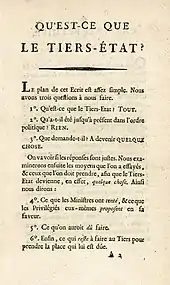 Bien qu'elle soit dépourvue de toute autorité législative, la réunion des états généraux a suscité de grands espoirs parmi la population française[30]. Les paysans espèrent une amélioration de leurs conditions de vie avec l'allègement, voire l'abandon des droits seigneuriaux[31]. La bourgeoisie espère l'instauration de l'égalité devant la loi et plus confusément, l'établissement d'une monarchie parlementaire ou d'un gouvernement représentatif[32]. Elle peut compter sur le soutien d'une petite partie de la noblesse acquise aux idées nouvelles et du bas-clergé sensible aux difficultés du peuple. Dès la fin de l'année 1788, mémoires, libelles et périodiques sur la convocation prochaine se multiplient[33]. Villes et villages français s'informent ainsi des débats sur la composition et l'organisation des États du Royaume. La tradition avait sanctionné la pratique d'un vote par ordre qui met le tiers en minorité. En septembre 1788, le Parlement de Paris confirme que les États doivent prendre les formes de 1614[34].