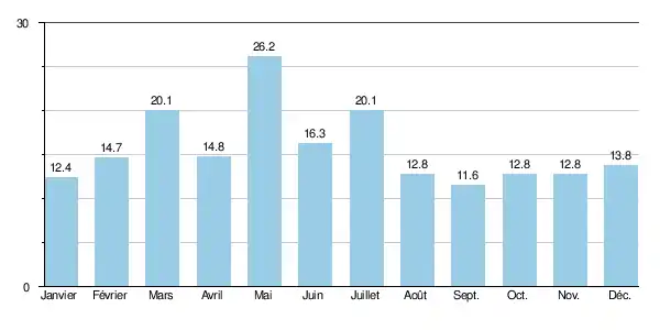 | Précipitations (mm) | 12,4 | 14,7 | 20,1 | 14,8 | 26,2 | 16,3 | 20,1 | 12,8 | 11,6 | 12,8 | 12,8 | 13,8 | 188,2 |
