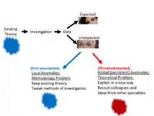 Dunbar et Fugelsang suggèrent que le processus de découverte commence souvent lorsqu'un chercheur trouve des bogues dans son expérience. Ces résultats inattendus conduisent un chercheur à douter de lui-même et à tenter de corriger ce qu'il pense être une erreur dans sa propre méthodologie. Le premier recours consiste à expliquer l'erreur en utilisant des hypothèses locales (par exemple des analogies typiques de la discipline). Ce processus est également local dans le sens où le scientifique est relativement indépendant ou travaille avec un partenaire. Finalement, le chercheur décide que l'erreur est trop persistante et systématique pour être une coïncidence. Le doute de soi est complet, et les méthodes deviennent donc plus larges: le chercheur commence à penser à des explications théoriques de l'erreur, cherchant parfois l'aide de collègues de différents domaines d'expertise. Les aspects hautement contrôlés, prudents, curieux et même sociaux de la méthode scientifique sont ce qui la rend bien adaptée à l'identification des erreurs systématiques persistantes (anomalies).