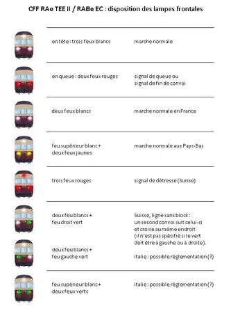 La disposition particulière des lampes frontales est à souligner. Chaque voiture-pilote possède 5 feux : 1 supérieur et 4 inférieurs (2 de chaque côté). Le feu supérieur et les deux feux extérieurs éclairent en blanc ou rouge (3 blancs : marche normale ; 2 rouges : fin de convoi ; 3 rouges : signal d'alerte aux CFF). Les deux feux intérieurs sont commutables jaune ou vert (jaune : signalisation NS ; vert : disposition spéciale FS)