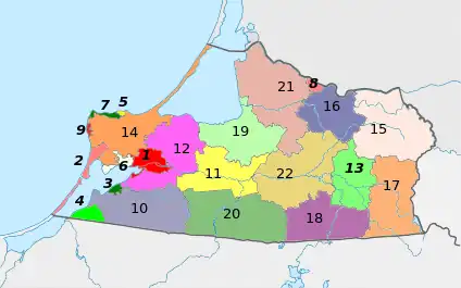 Tout d'abord, il y a 10 okrougs urbains, qui correspondent aux 8 villes régionales dans l'oblast, à la commune régionale, et au raïon de Goussev[alpha 2]. Pour un des okrougs, celui de Kaliningrad, il est encore subdivisé en raïons urbains (ru). Ces raïons urbains sont ceux de Lénine, de Moscou et Centrale, les arrondissements de la ville en somme.