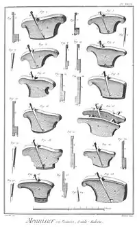 • Le tarabiscot est un support simple où s'insère une lame formée à façon par l'ébéniste à la meule ou à la lime, pour être adaptée à au travail à accomplir ; elle comporte en général un morfil crée spécifiquement pour améliorer la coupe. Une butée latérale permet de suivre le champ d'une pièce et permet de créer des moulures courbes. Selon l'angle d'incidence, l'ébéniste enlève par raclage au cours de passes successives des copeaux qui forment la moulure.