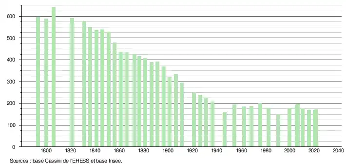 L'évolution du nombre d'habitants est connue à travers les recensements de la population effectués dans la commune depuis 1793. Pour les communes de moins de 10 000 habitants, une enquête de recensement portant sur toute la population est réalisée tous les cinq ans, les populations légales des années intermédiaires étant quant à elles estimées par interpolation ou extrapolation[17]. Pour la commune, le premier recensement exhaustif entrant dans le cadre du nouveau dispositif a été réalisé en 2005[18].