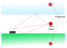 - dans une configuration bistatique, le récepteur est distinct de l'émetteur et totalement passif, donc moins facilement détectable par un ennemi potentiel. En plus d'émetteurs radar spécialisés, il est également envisagé d'utiliser des émetteurs dits d'opportunité comme des antennes-relais GSM, ou de télévision, ou des satellites GPS dont le signal est détourné de leur utilisation primaire pour effectuer à moindres frais et de manière discrète un travail de mesure habituellement laissé aux radars. Enfin, la possibilité de positionner l'émetteur et le récepteur à volonté permet d'explorer d'autres configurations de réflexion permettant d'augmenter le volume d'informations disponibles sur la cible. En contrepartie, l'utilisation d'une configuration bistatique demande une bonne synchronisation entre l'émetteur et le récepteur, et l'utilisation d'une géométrie d'acquisition moins triviale.