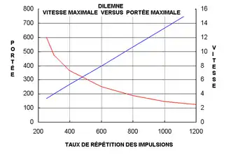 C'est ce qu'on appelle la vitesse de Nyquist. Pour obtenir une meilleure détermination de la vitesse des cibles, il faut envoyer des impulsions très rapprochées, donc avec très petit. Mais on sait également que la portée en réflectivité est directement proportionnelle à , ce qui demande un grand pour être sûr de la position des échos revenant de loin sans ambiguïté.
