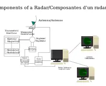 - un étage de traitement de signal permettant de traiter le signal brut afin d'en extraire des données utiles à l'opérateur (détection, suivi et identification de cible; extraction de paramètres météorologiques, océanographiques, etc.). Le tout est contrôlé par le système électronique du radar, programmé selon un logiciel de sondage. Les données obtenues sont alors affichées aux utilisateurs.