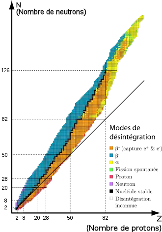 Le mode de désintégration d'un nucléide radioactif dépend de sa position par rapport aux nucléides (stables ou moins instables) de la vallée de stabilité les plus proches de lui dans le tableau Z-N (figure ci-contre). D'une façon générale, les nucléides situés à gauche de la vallée ont trop de neutrons (en comparaison de leur nombre de protons) et subissent une désintégration β− ; les nucléides situés à droite sont excédentaires en protons et subissent une désintégration ε (capture électronique) ou plus rarement une désintégration β+ ; les nucléides de masse atomique supérieure à 208 et proches de la vallée subissent une désintégration α. Il y a diverses exceptions, qui s'expliquent notamment par des considérations de cinétique.