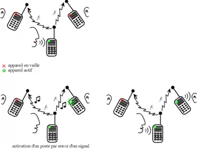 Dans certaines normes, comme la PMR446 (émetteurs de faible portée et utilisables sans licence), les appareils sont en permanence en mode écoute sélective. Un bouton permet de désigner l'indicatif en fonction, appelé CTCSS (pour continuous tone squelch system). Lorsque l'on appuie sur le bouton d'émission, l'émetteur envoie automatiquement l'indicatif (inaudible) du CTSS choisi, et seuls les appareils réglés sur le même CTSS s'activent. Ceci permet de scinder la fréquence en sous-réseaux, chaque poste ne recevant que les messages du sous-réseau auquel il appartient. Il y a cependant des risques de « collision » : si deux postes sur deux CTCSS différents émettent simultanément (ils ne peuvent pas savoir que l'autre émet), leurs messages interfèrent.