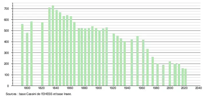 L'évolution du nombre d'habitants est connue à travers les recensements de la population effectués dans la commune depuis 1793. Pour les communes de moins de 10 000 habitants, une enquête de recensement portant sur toute la population est réalisée tous les cinq ans, les populations légales des années intermédiaires étant quant à elles estimées par interpolation ou extrapolation[20]. Pour la commune, le premier recensement exhaustif entrant dans le cadre du nouveau dispositif a été réalisé en 2007[21].