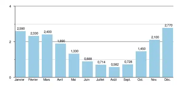 Le débit journalier maximal a été observé le pour 41,30 m3/s. Le débit instantané maximal a été observé le même à 14h54 avec 55,70 m3/s en même temps que la hauteur maximale instantanée de 242 cm soit 2,42 m[3].