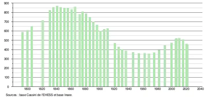 L'évolution du nombre d'habitants est connue à travers les recensements de la population effectués dans la commune depuis 1793. Pour les communes de moins de 10 000 habitants, une enquête de recensement portant sur toute la population est réalisée tous les cinq ans, les populations légales des années intermédiaires étant quant à elles estimées par interpolation ou extrapolation[17]. Pour la commune, le premier recensement exhaustif entrant dans le cadre du nouveau dispositif a été réalisé en 2005[18].