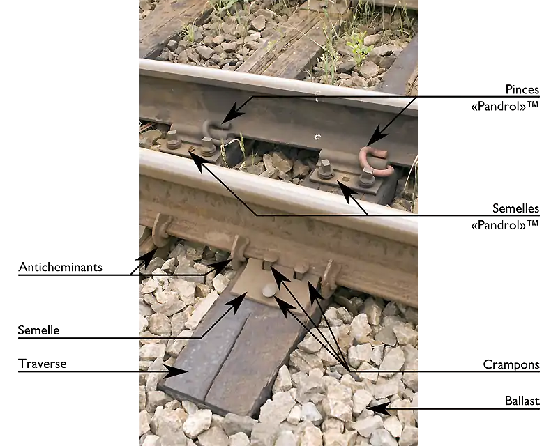 Ci-dessus, on a un exemple des deux types de fixations dans un aiguillage ; le rail du haut est la voie déviée et est donc soumis à un effort supplémentaire, d’où les fixations élastiques (« Pandrol » dans le cas présent).