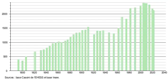 L'évolution du nombre d'habitants est connue à travers les recensements de la population effectués dans la commune depuis 1793. Pour les communes de moins de 10 000 habitants, une enquête de recensement portant sur toute la population est réalisée tous les cinq ans, les populations légales des années intermédiaires étant quant à elles estimées par interpolation ou extrapolation[36]. Pour la commune, le premier recensement exhaustif entrant dans le cadre du nouveau dispositif a été réalisé en 2004[37].