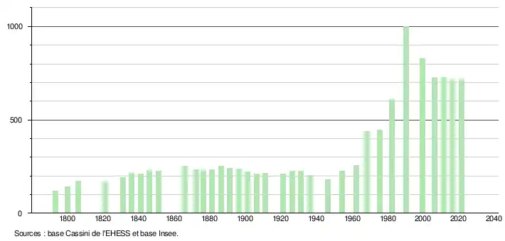 L'évolution du nombre d'habitants est connue à travers les recensements de la population effectués dans la commune depuis 1793. Pour les communes de moins de 10 000 habitants, une enquête de recensement portant sur toute la population est réalisée tous les cinq ans, les populations légales des années intermédiaires étant quant à elles estimées par interpolation ou extrapolation[23]. Pour la commune, le premier recensement exhaustif entrant dans le cadre du nouveau dispositif a été réalisé en 2006[24].