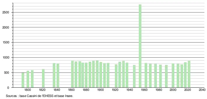 L'évolution du nombre d'habitants est connue à travers les recensements de la population effectués dans la commune depuis 1793. Pour les communes de moins de 10 000 habitants, une enquête de recensement portant sur toute la population est réalisée tous les cinq ans, les populations légales des années intermédiaires étant quant à elles estimées par interpolation ou extrapolation[18]. Pour la commune, le premier recensement exhaustif entrant dans le cadre du nouveau dispositif a été réalisé en 2006[19].