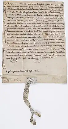 Petite charte en parchemin rédigée en latin, chirographe. Trace de sceau pendant à la lanière de cuir blanc imprimée en noir. Archives nationales de France.