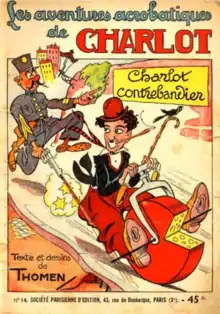Les premières adaptations du personnage de Charlot furent réalisées par des auteurs anglo-saxons comme le Britannique Bertie Brown (1887-1974) en 1914 dans The Funny Wonder[6], mais également par d’autres auteurs en Italie, Espagne, Amérique… C’est en France que son existence est la plus durable avec l'adaptation de Raoul Thomen qui l'incarne dans Les Aventures acrobatiques de Charlot, série qui débute en 1921 dans le no 136 du journal Cri-Cri. Ces publications vont se poursuivre dans les journaux hebdomadaires Boum !, L’As et L'Épatant jusqu’en 1939, où il conclut en disant : « Finies les acrobaties ! Finies les aventures ! Que chacun fasse seulement la dixième partie ! Moi, j’ai bien gagné de me reposer ! ». Les éditions des frères Offenstadt (SPE) rassemblent, en parallèle, toutes les planches de cette série pour les éditer sous forme d'albums, quinze au total, de 1926 à 1938.