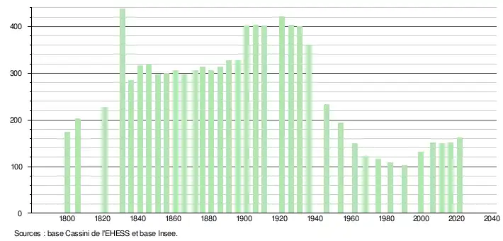 L'évolution du nombre d'habitants est connue à travers les recensements de la population effectués dans la commune depuis 1800. Pour les communes de moins de 10 000 habitants, une enquête de recensement portant sur toute la population est réalisée tous les cinq ans, les populations légales des années intermédiaires étant quant à elles estimées par interpolation ou extrapolation[9]. Pour la commune, le premier recensement exhaustif entrant dans le cadre du nouveau dispositif a été réalisé en 2006[10].