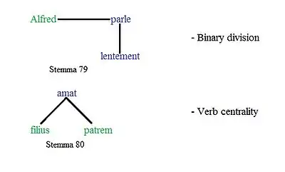 Tesnière représente les rapports syntaxiques par des arbres appelés stemmas. Par exemple, par l’arbre de la phrase Alfred parle lentement, il illustre la vision qu’il conteste, selon laquelle le sujet et le prédicat ont le même statut hiérarchique. Par l’arbre de la phrase (la) Filius amat patrem « Le fils aime le père », il représente sa vision sur le sujet et le complément comme étant tous les deux subordonnés au prédicat avec le même statut hiérarchique[21].