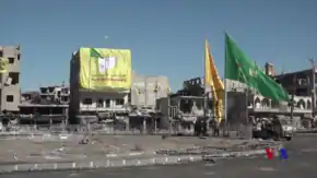 Le , les Forces démocratiques syriennes (FDS) soutenues par les forces aériennes de la coalition internationale lancent une offensive baptisée Colère de l'Euphrate avec pour objectif de prendre la ville à l'État islamique[38]. Début 2017, 200 000 à 300 000 civils (dont 80 000 déplacés internes) vivent à l'intérieur[39],[40],[41]. À la veille de l'entrée des FDS, ils sont encore 160 000 selon les Nations unies[41]. Les FDS pénètrent dans Raqqa par l'ouest (quartier de Harqalah (ar)) et l'est (quartier d'al-Mashalab) le [42], et s'en emparent entièrement le [43]. En quatre mois, les combats font plus de 3 000 morts, dont un tiers de civils, et la ville est détruite à 80 %[44], en raison des bombardements intensifs de la coalition. En juin 2018, la coalition internationale annonce un plan de reconstruction de la ville ainsi que de déminage[réf. nécessaire].