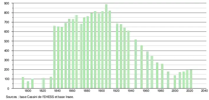 L'évolution du nombre d'habitants est connue à travers les recensements de la population effectués dans la commune depuis 1793. Pour les communes de moins de 10 000 habitants, une enquête de recensement portant sur toute la population est réalisée tous les cinq ans, les populations légales des années intermédiaires étant quant à elles estimées par interpolation ou extrapolation[21]. Pour la commune, le premier recensement exhaustif entrant dans le cadre du nouveau dispositif a été réalisé en 2006[22].