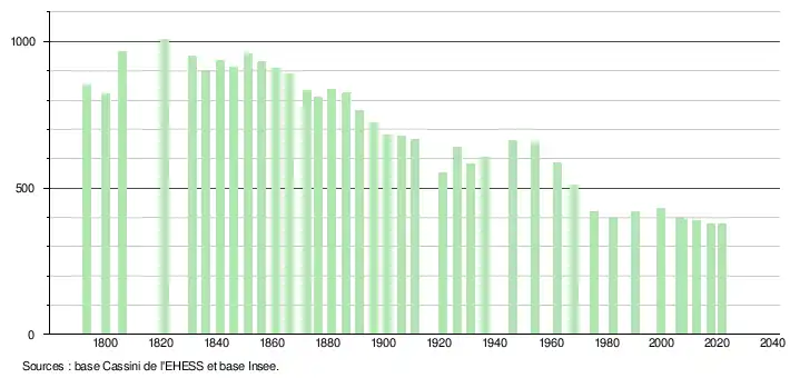 L'évolution du nombre d'habitants est connue à travers les recensements de la population effectués dans la commune depuis 1793. Pour les communes de moins de 10 000 habitants, une enquête de recensement portant sur toute la population est réalisée tous les cinq ans, les populations légales des années intermédiaires étant quant à elles estimées par interpolation ou extrapolation[30]. Pour la commune, le premier recensement exhaustif entrant dans le cadre du nouveau dispositif a été réalisé en 2007[31].