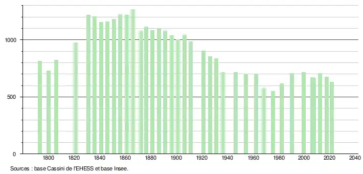 L'évolution du nombre d'habitants est connue à travers les recensements de la population effectués dans la commune depuis 1793. Pour les communes de moins de 10 000 habitants, une enquête de recensement portant sur toute la population est réalisée tous les cinq ans, les populations légales des années intermédiaires étant quant à elles estimées par interpolation ou extrapolation[24]. Pour la commune, le premier recensement exhaustif entrant dans le cadre du nouveau dispositif a été réalisé en 2007[25].