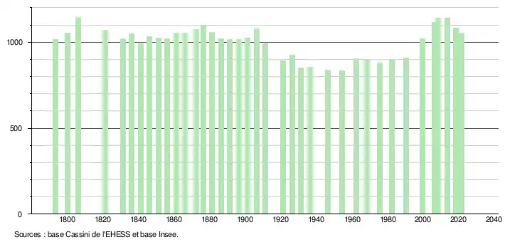 L'évolution du nombre d'habitants est connue à travers les recensements de la population effectués dans la commune depuis 1793. Pour les communes de moins de 10 000 habitants, une enquête de recensement portant sur toute la population est réalisée tous les cinq ans, les populations légales des années intermédiaires étant quant à elles estimées par interpolation ou extrapolation[28]. Pour la commune, le premier recensement exhaustif entrant dans le cadre du nouveau dispositif a été réalisé en 2008[29].