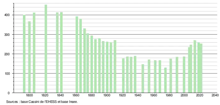 L'évolution du nombre d'habitants est connue à travers les recensements de la population effectués dans la commune depuis 1793. Pour les communes de moins de 10 000 habitants, une enquête de recensement portant sur toute la population est réalisée tous les cinq ans, les populations légales des années intermédiaires étant quant à elles estimées par interpolation ou extrapolation[19]. Pour la commune, le premier recensement exhaustif entrant dans le cadre du nouveau dispositif a été réalisé en 2008[20].