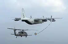 Plusieurs versions du Lockheed C-130 Hercules possèdent cette capacité. Ils ont aussi l'avantage de pouvoir voler suffisamment lentement pour ravitailler les hélicoptères[68].