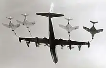 Le Boeing KC-135 Stratotanker, premier avion à réaction dédié au ravitaillement en vol, est développé en parallèle avec le Boeing 707 avec qui il partage nombre d'éléments, même si le fuselage du 707 est plus large. Cet avion entre en service en 1957 et constitue, depuis cette date, un élément-clé de la capacité de projection à longue distance de l'US Air Force. Plus de 700 exemplaires sont construits. Une grande partie sont, dans les années 1980, remotorisés avec des réacteurs plus modernes, augmentant considérablement leur capacité. Outre l'US Air Force, l'Armée de l'air française achète aussi cet avion (14 exemplaires). Le Chili, Singapour et la Turquie achètent ensuite des avions américains d'occasion. Dans les années 2020, le KC-135 est en cours de retrait progressif de l'USAF[52]. Des Boeing 707 construits pour le marché civil sont transformés en avions ravitailleurs, dans une configuration similaire à celle du KC-135, mais s'en distinguent par le diamètre supérieur du fuselage et la présence de hublots. En 2024, des Boeing 707 ravitailleurs sont encore utilisés par l'armée de l'air israélienne (mais leur remplacement est prévu[53]) et par la société militaire privée Omega Aerial Refueling Services[54]. Les armées de l'air italienne et espagnole ont disposé de tels avions, mais ils ont été remplacés[55].