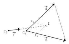 Un moyen simple et efficace pour calculer l'intersection d'un rayon avec un triangle consiste à calculer les coordonnées du point d'intersection I dans la base . Il suffit de résoudre l'équation vectorielle . À l'aide de la règle de Cramer, du produit mixte et en posant on obtient :