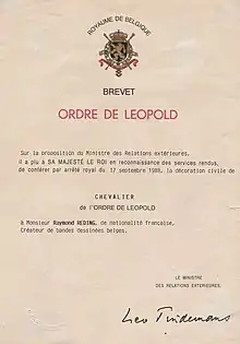 Chevalier de l'ordre de Léopold en décembre 1991 comme auteur ayant plus de vingt ans de carrière[41].