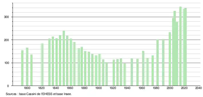 L'évolution du nombre d'habitants est connue à travers les recensements de la population effectués dans la commune depuis 1793. Pour les communes de moins de 10 000 habitants, une enquête de recensement portant sur toute la population est réalisée tous les cinq ans, les populations légales des années intermédiaires étant quant à elles estimées par interpolation ou extrapolation[17]. Pour la commune, le premier recensement exhaustif entrant dans le cadre du nouveau dispositif a été réalisé en 2004[18].