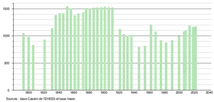 L'évolution du nombre d'habitants est connue à travers les recensements de la population effectués dans la commune depuis 1793. Pour les communes de moins de 10 000 habitants, une enquête de recensement portant sur toute la population est réalisée tous les cinq ans, les populations légales des années intermédiaires étant quant à elles estimées par interpolation ou extrapolation[39]. Pour la commune, le premier recensement exhaustif entrant dans le cadre du nouveau dispositif a été réalisé en 2008[40].
