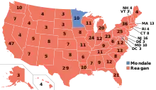 Reagan lança sa campagne en déclarant « Je crois dans les droits des États », à Philadelphia, dans le Mississippi, connue à l'époque pour le meurtre de trois membres du mouvement des droits civiques en 1964[89],[90],[91]. Après avoir obtenu la nomination républicaine, Reagan choisit l'un de ses principaux opposants, George H.W. Bush, pour devenir son colistier. Sa prestation lors du débat télévisé d'octobre revigora sa campagne. Reagan remporta l'élection de 1980 en rassemblant 44 États et 489 votes de grands électeurs contre 49 pour Carter. Reagan obtint 50,7 % du vote populaire contre 41 % pour Carter et 6,7 % pour l'indépendant (républicain libéral) John Anderson[92]. Les républicains reprirent le contrôle du Sénat pour la première fois depuis 1952 et gagnèrent 34 sièges à la Chambre des représentants mais les démocrates conservèrent la majorité.