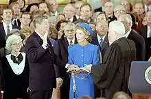 En tant que chef de l'État, Ronald Reagan met en place une politique de l'offre (surnommée Reaganomics), qui repose essentiellement sur un contrôle de la monnaie, visant à réduire l'inflation, ainsi que sur une réduction des dépenses fédérales non liées à la défense. Au début de son mandat, il est blessé lors d'une tentative d'assassinat, subit la crise américaine de 1982, adopte une ligne dure face aux syndicats, ordonne l'invasion de la Grenade, fait face aux attentats de Beyrouth du 23 octobre 1983 et doit répondre à l'abattage du vol Korean Air Lines 007 par un chasseur soviétique. Il est réélu à une écrasante majorité en 1984, remportant 49 des 50 États.