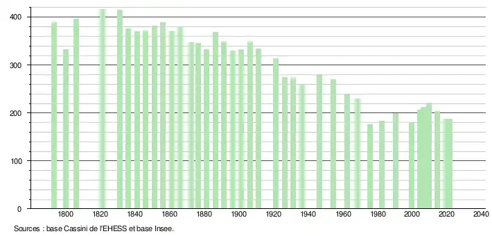 L'évolution du nombre d'habitants est connue à travers les recensements de la population effectués dans la commune depuis 1793. Pour les communes de moins de 10 000 habitants, une enquête de recensement portant sur toute la population est réalisée tous les cinq ans, les populations légales des années intermédiaires étant quant à elles estimées par interpolation ou extrapolation[33]. Pour la commune, le premier recensement exhaustif entrant dans le cadre du nouveau dispositif a été réalisé en 2004[34].