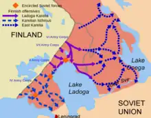 Au début de la guerre, les forces finlandaises libèrent l'isthme de Carélie, territoire cédée à l'Union soviétique le 13 mars 1940, dans le cadre du traité de paix de Moscou, qui marquait la fin de la guerre d'Hiver. Plus tard, à l'été 1944, l'Union soviétique reconquiert la partie orientale de la partie sud de l'isthme lors de l'offensive Vyborg-Petrozavodsk.