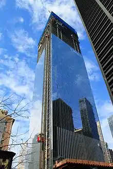 Le Three World Trade Center devait à l'origine être un podium de sept étages, avec une tour de bureaux de 73 étage sortant au-dessus de celui-ci. Les attaches en forme de diamant initialement prévues pour les faces avant et arrière de l'immeuble furent retirées du plan de la tour. Toutefois, les attaches diagonales sur les côtés furent conservées. Les quatre flèches du plan de la tour permette à la tour d'atteindre une hauteur de 378 mètres, ce qui en ferait le troisième bâtiment le plus haut à New York[115]. La surface totale du bâtiment est prévue pour comprendre 190 000 m2 de bureaux et de commerces. Le début de la construction du bâtiment eut lieu en , et il devait être terminé en 2014[116],[117]. L'ingénieur en structure pour le bâtiment est WSP[118]. En , six piles à combustible sont livrées sur le chantier, prévues pour fournir environ 30 % de la puissance de la future tour[119].