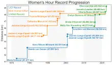 La technologie prend ensuite à nouveau le dessus, dans le cadre des règles UCI de 1934, pour atteindre en 1996 le record absolu de 56,375 km par Chris Boardman, qui se trouvait pourtant près de la mer, à Manchester. En septembre 2000, l'UCI (Union cycliste internationale) met en place des critères de validation du record, notamment quant aux caractéristiques du vélo, qui redonnent le record à Merckx. En octobre 2000, Chris Boardman porte le record à 49,441 km, soit dix mètres de plus, et Ondřej Sosenka à 49,700 km en juillet 2005. Le , l'Allemand Jens Voigt réalise 51,115 km[2] sur le vélodrome de Granges, en Suisse, et le , l'Autrichien Matthias Brändle parcourt 51,852 km sur le vélodrome d'Aigle, en Suisse. Le , le Britannique Alex Dowsett bat le record de l'heure établi quelques semaines plus tôt par Rohan Dennis, en accomplissant une distance de 52,937 km[3] sur le vélodrome de Manchester, en Angleterre. Le 7 juin 2015, le Britannique Bradley Wiggins bat à son tour le record de l'heure en parcourant une distance de 54,526 km sur le vélodrome olympique de Londres. Puis c'est le Belge Victor Campenaerts qui réalise 55,089 km le 16 avril 2019 à Aguascalientes au Mexique. Le 19 août 2022, le Britannique Daniel Bigham établit un nouveau record de 55,548 km sur le vélodrome de Granges, en Suisse[4]. Le 8 octobre 2022, sur le même vélodrome, Filippo Ganna établit le record actuel en courant 56,792 km et prenant ainsi le record à son ingénieur de course Dan Bigham [5].